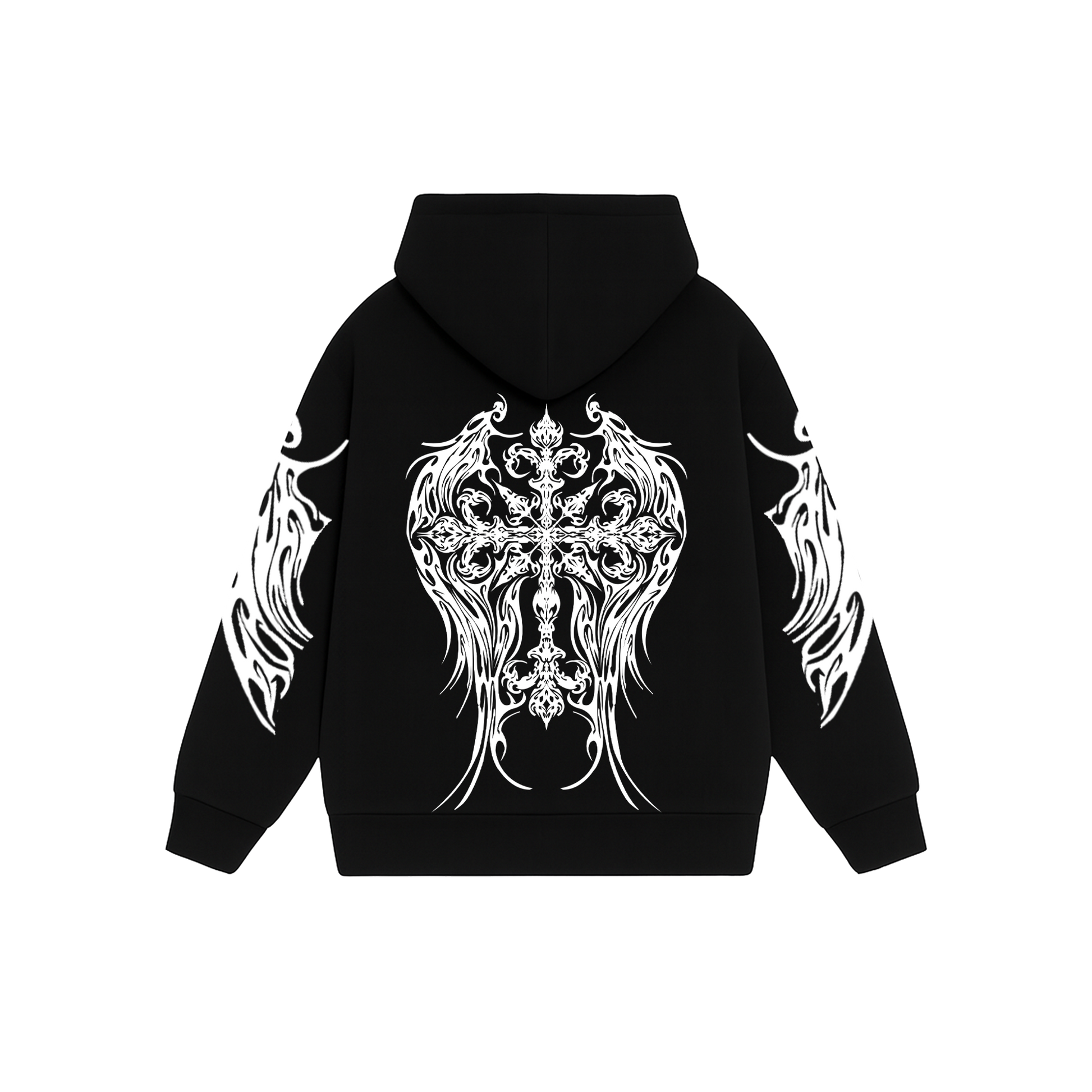 The Eternal Archangel Hoodie embodies the fusion of divinity and defiance — a piece that radiates celestial energy through a gothic lens. The intricate cross design on the back, framed by angelic wing motifs, captures the eternal struggle between purity and power. Each line and curve is sculpted to evoke strength, redemption, and the sacred beauty of rebellion.