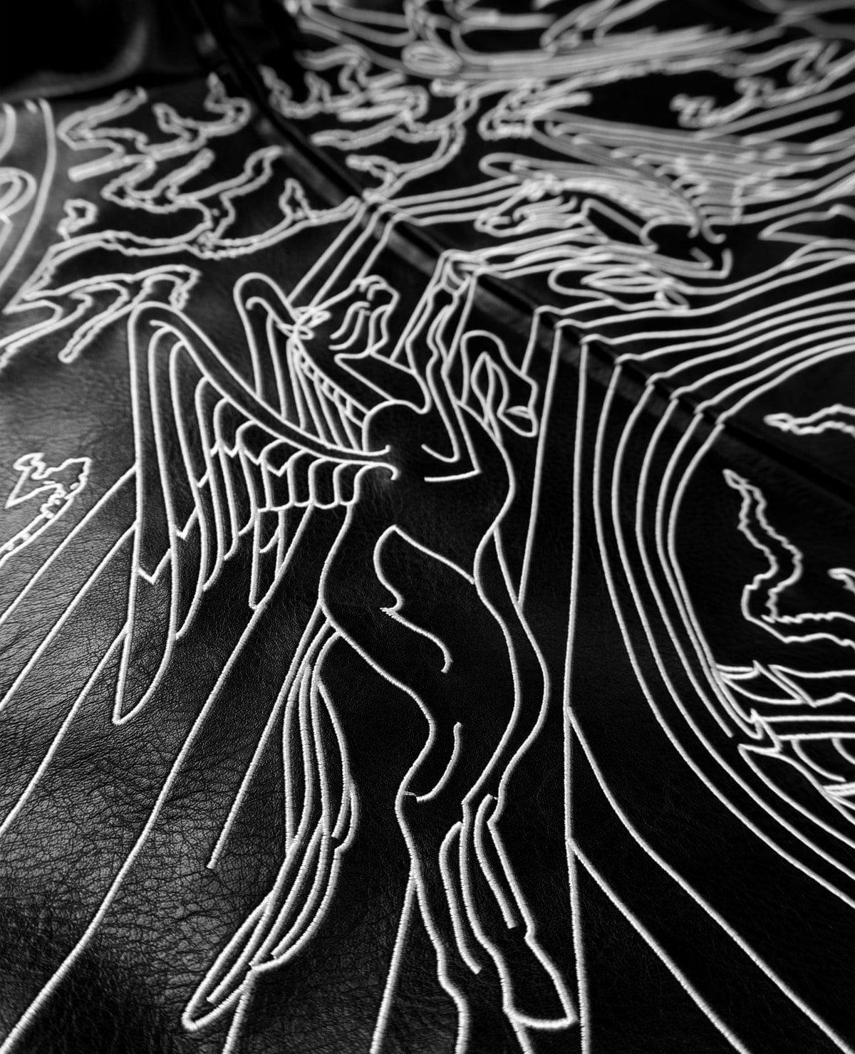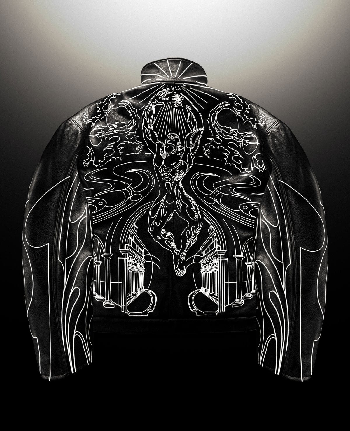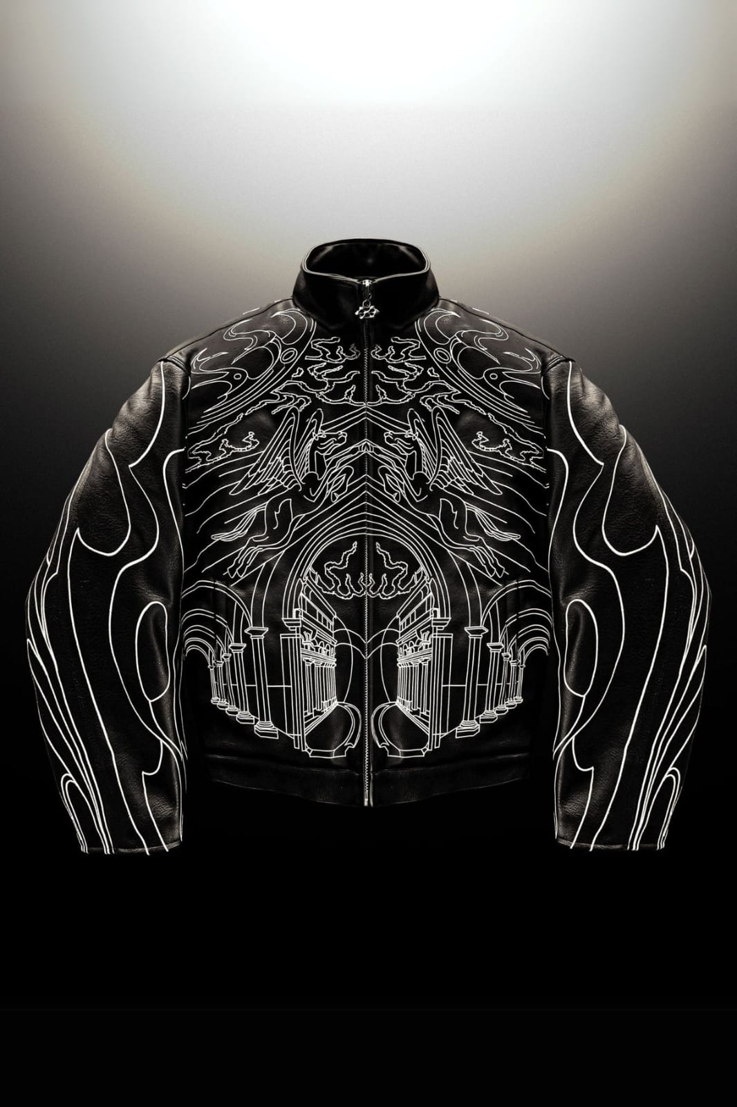 Where divine artistry meets rebellion. Heaven’s Gate is a statement leather bomber designed to blur the line between sacred and street. Crafted in premium black leather, the jacket features intricate contrast embroidery inspired by gothic cathedrals, celestial figures, and flame linework—creating a piece that feels both powerful and untouchable.